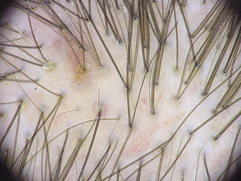 Клінічно візуалізуються численні осередки втрати волосся невеликого розміру від 0,5 см до 2 см неправильної форми, розповсюджені по всьому скальпу з найвищою концентрацією на маківці. При пальпації вогнища щільні, викликають незначні больові відчуття у пацієнта. Волосся в осередках відсутнє або поодиноке. Наявна еритема, поодинокі гнійники, лущення. Pull test негативний.